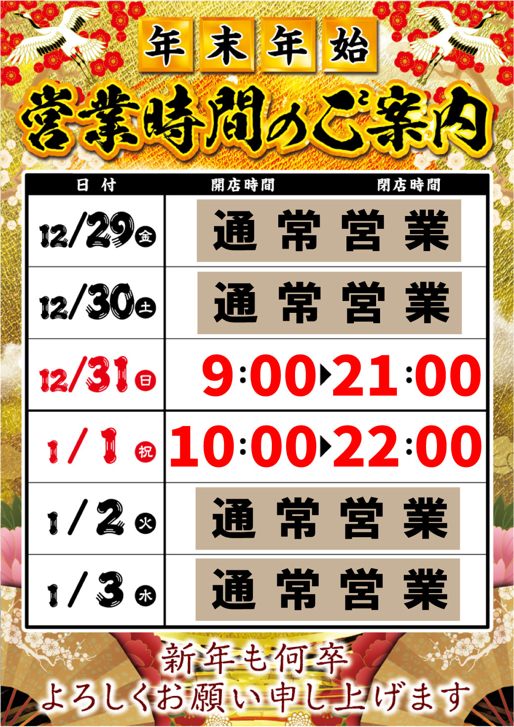 2日間のみ、営業時間の変更とさせていただきます。なお、上記2日間においては、ご遊戯延長サービスは実施いたしませんので予めご了承くださいませ。